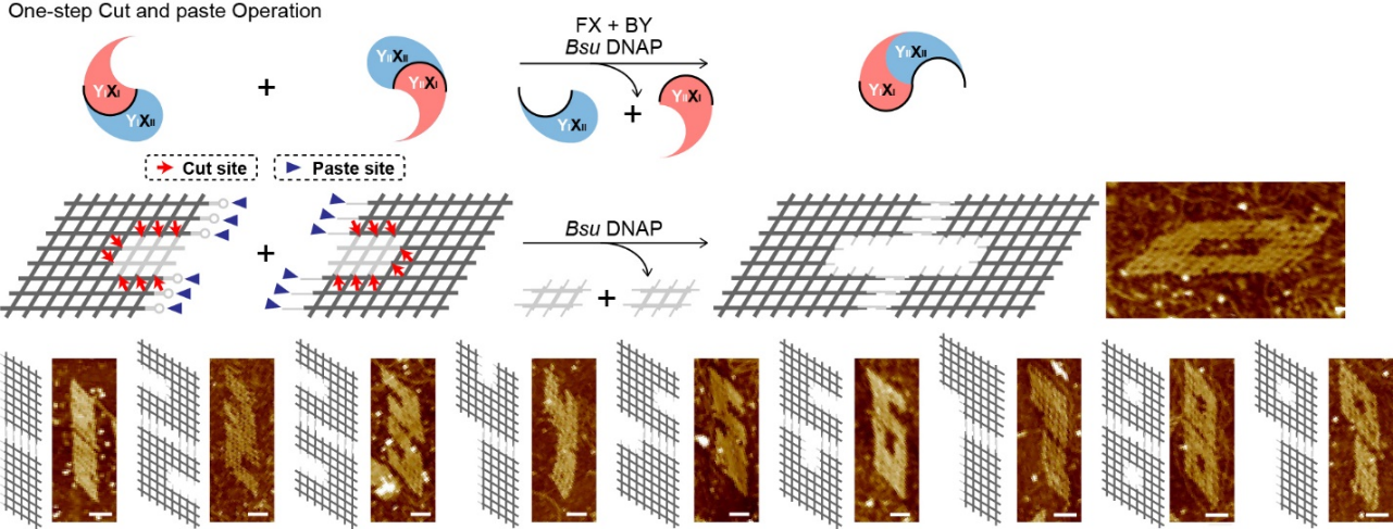 To synchronize two switches, the researchers achieved a one-step cut and paste operation to present the divergent activity of the enzyme. In the one-pot reaction, multiple structures were cut into diverse pieces while pasted into new shapes. The working sites of Bsu DNAP in two switches were both designed with the 8×8 lattices to reform different digital shape lattices nanostructures. The Yin-Yang’s opposite and alternate are shown in these results.