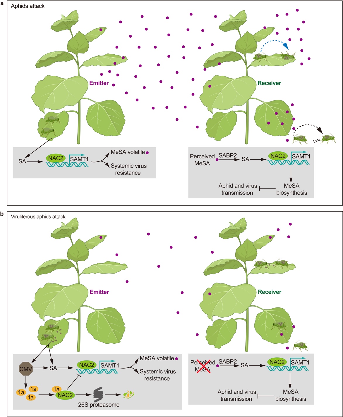 Most plant viruses rely on intermediaries such as insects for transmission. Upon insects’ infestation, plants produce VOCs to repel the insects and attract insects` natural enemies. Additionally, VOC can serve as aerial cues and be perceived to elicit defenses in neighboring ‘receiver’ plants. The Liu Yule group reported that aphid-attack induces plant MeSA production, and airborne MeSA is perceived and converted to SA by SABP2 in neighboring plants. SA then cascades signal transduction to activate the NAC2-SAMT1 module for MeSA biosynthesis to induce neighboring plants anti-aphid immunity and reduce virus transmission. Moreover, Liu Yule group also found that some aphid-transmitted viruses, such as cucumber mosaic virus and potato Y virus, encode proteins with helicase domains that interact with the NAC2 protein. This interaction alters the subcellular localization of NAC2, promoting NAC2 retained in the cytoplasm and degraded by the 26S proteasome system, subsequently negatively regulating MeSA mediated airborne defense (Figure 1). This study reveals the detailed molecular basis of plant airborne immunity and the counter-defense mechanism of viruses, shedding light on a novel mutualistic coevolution between aphids and viruses.