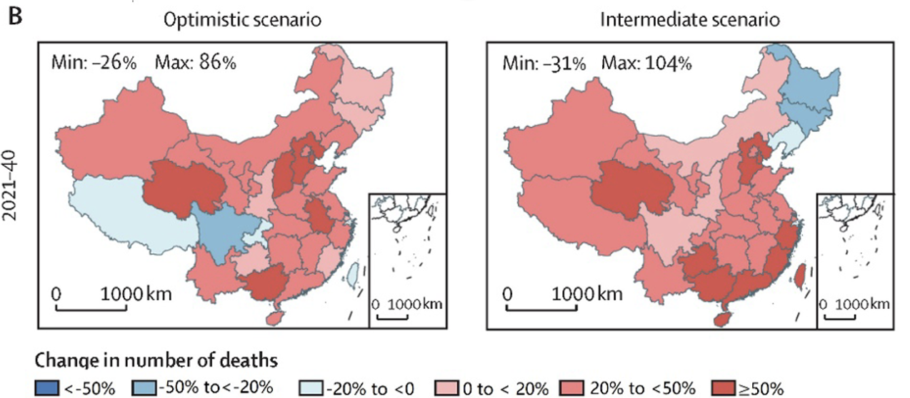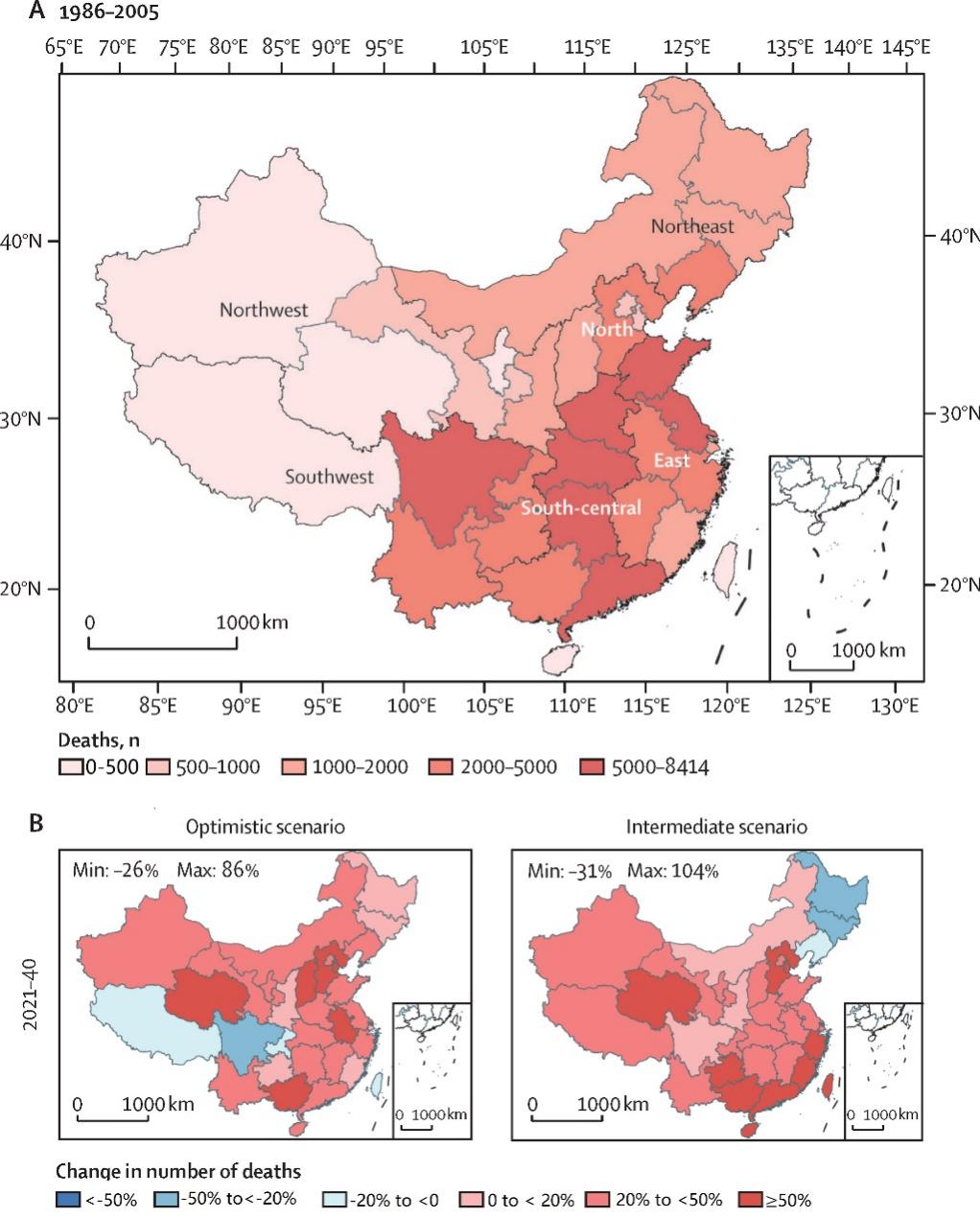 Map B shows the projected changes in all-cause deaths in China between 2021–2040 due to landscape fire-related PM2.5.