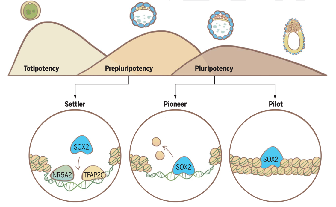 By optimizing CUT&RUN technology, the researchers first captured the chromatin binding of the pluripotency factor SOX2 in mouse embryos, from day 3.5 (E3.5) to day 7.5 (E7.5), covering the entire process of pluripotency program progression. Using Sox2 knockout embryos and embryonic stem cells, the researchers systematically investigated the role of SOX2 in gene expression and chromatin opening during the establishment and transition of pluripotency. Their results revealed that the interaction between SOX2 and chromatin during early development does not follow a simple pioneer factor model. Instead, SOX2 exhibits several distinct chromatin interaction modes, including "settler binding," "pioneer binding," and "pilot binding." In E3.5 ICM, SOX2 primarily binds to pre-opened enhancers ("settler binding") and promotes ICM-specific gene expression. These pre-accessible enhancers are partially opened by early-expressing transcription factors such as TFAP2C and NR5A2. NR5A2 was recently identified as a key TF regulator of early ICM and TE programs in totipotent embryos by the same group (Lai et al., Cell Research, 2023). These data suggest that E3.5 ICM is in a distinctive "pre-pluripotency" state between totipotency and pluripotency. During this period, the pluripotency regulatory network is primitive, and pioneer pluripotency factors have not yet taken a dominant role. However, through binding to pre-open chromatin, SOX2 facilitates a successful transition from upstream developmental programs to pluripotency program. Subsequently, E3.5 cells enter the naive pluripotency of the epiblast at day 4.5 (E4.5) and the formative pluripotency of the epiblast at day 5.5 (E5.5). At this point, SOX2 undergoes genomewide relocation and massively opens chromatin to initiate the naive and formative pluripotency programs ("pioneer binding"). Additionally, SOX2 can also bind to a subset of enhancers without fully opening them. Instead, it prepares these enhancers for rapid opening for the next developmental stage ("pilot binding").