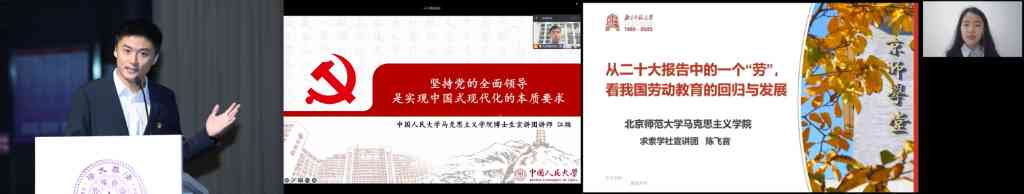 在随后进行的首场示范宣讲中,开云游戏平台马克思主义学院2021级博士研究生车宗凯、中国人民大学马克思主义学院2019级博士研究生江烜、北京师范大学马克思主义学院2021级本科生陈飞音分别围绕“中国式现代化:我们的光荣与梦想”“坚持党的全面领导是实现中国式现代化的本质要求”“从二十大报告中的一个‘劳’,看我国劳动教育的回归与发展”三个主题进行示范宣讲,从青年角度出发分享学习党的二十大精神的心得体会。