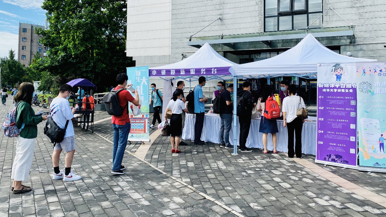 C楼前广场是迎新集中点,不同片区提供不同服务,一站式满足新生同学信息获取、纪念留念等多元需求。